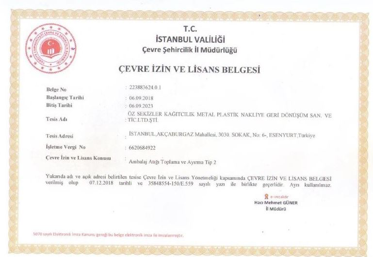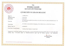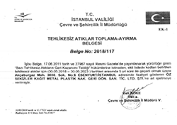 29.01.2013 tarihinde Tehlikesiz Atık Toplama Ayırma Belgesi, 06.09.2013 tarihinde Çevre İzin ve Lisans Belgesi, 14.03.2014 tarihinde ise (tehlikeli) Atık Taşıyan Araçlar için lisans belgesi alınmıştır.